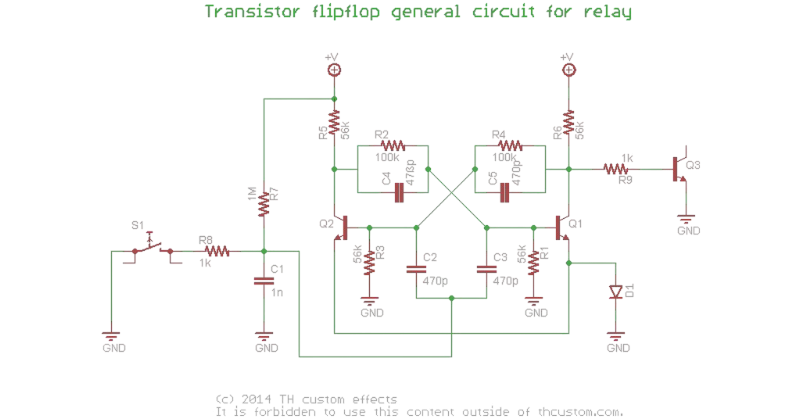 Remember the transistor flipflop in the buffered bypass circuit? Here it is again. For sure it can also control a relay as it already has the necessary voltage levels needed.