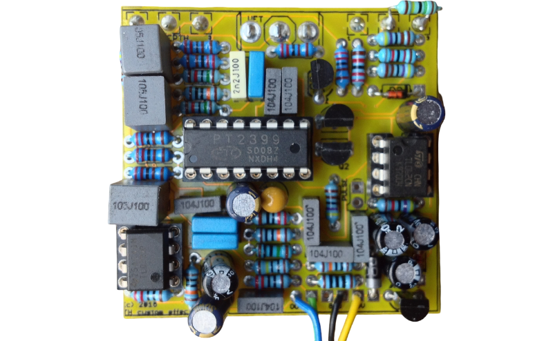 Jenny GreenTeeth started off as an experiment in making a chorus effect using the PT2399. Chorus is created by passing the signal through a very short delay line, somewhere between about 8ms and 25ms. The delay time is modulated and the delayed sgnal is mixed back with the original un-delayed signal. Some feedback (‘repeats’) is often applied too, to thicken the effect. The PT2399 has a minimum delay time of about 25ms, which is just short enough to do a thick chorus effect. The more subtale chorus effects that a ‘proper’ chorus pedal would do are not avaialable as they require shorter delay times ( but I’m one of those people who only ever wants his chorus thick!). However, as well as getting chorus I soon found that various other unexpected effects could also be had for free, including pitch bend and a kind of ring modulation. That’s why I’ve called it ‘weird chorus’.